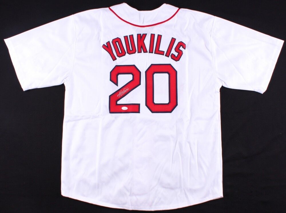 Custom on-field style jersey. Everything sewn on, size XL. Hand-signed in silver paint pen by Kevin Youkilis.An intense performer on the playing field, Youkilis was known for his scrappiness, grittiness, dirt-stained jerseys, home-plate collisions, and his strange batting stance. He excelled despite a physique that led many observers to underestimate his athletic ability. The lot / autograph(s) includes an official James Spence Authentication (JSA) hologram and matching COA for authenticity purposes. The signing of this item was witnessed by JSA.Authentication: JSA COA