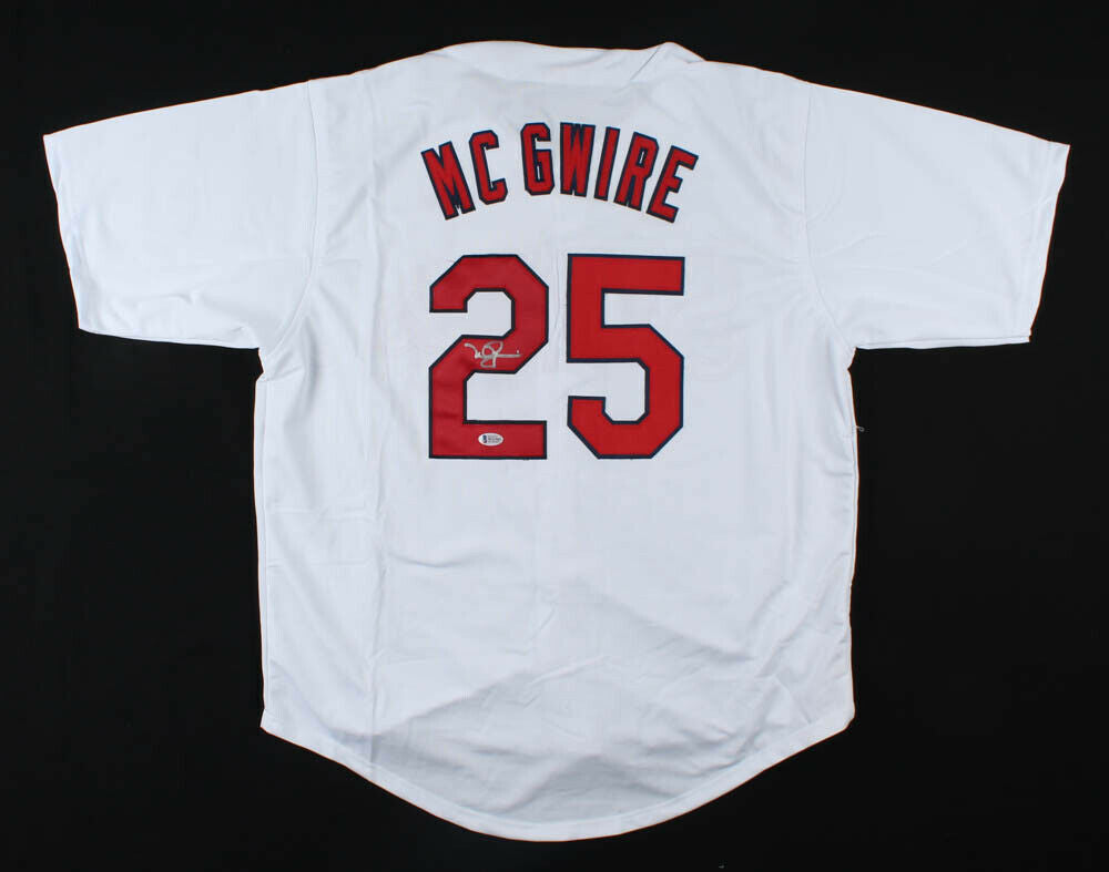 Custom on-field style jersey. Everything is sewn on, size XL. Hand-signed by Mark McGwire.The lot / autograph(s) includes an official Beckett Authentication Services serially numbered hologram for authenticity purposes. The signing of this item was witnessed by Beckett.Authentication: Beckett Hologram