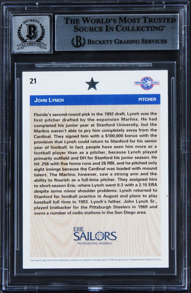 This Autographed 1992 Upper Deck Minors #21 Card has been Personally Signed by John Lynch of the Miami Marlins. This item is 100% Authentic, it comes slabbed and authenticated by Beckett Authentication Services. We conducted an autograph signing with John Lynch where multiples of the same item were signed. While the photographs are representative of this item, the size, placement and strength of the signature may vary. Each item is hand signed, therefore, each autograph is unique. This item can be verified through BAS Slabbed.