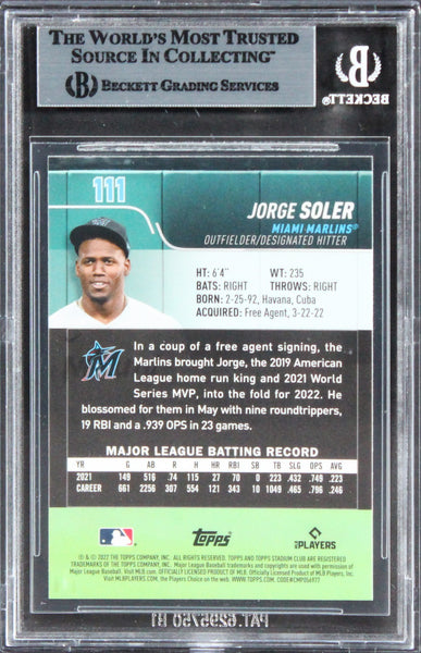This Autographed 2022 Stadium Club Chrome #111 Card has been Personally Signed by Jorge Soler of the Miami Marlins. This item is 100% Authentic, it comes slabbed and authenticated by Beckett Authentication Services. The authenticity can be verified on Beckett Authentication Services website.