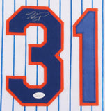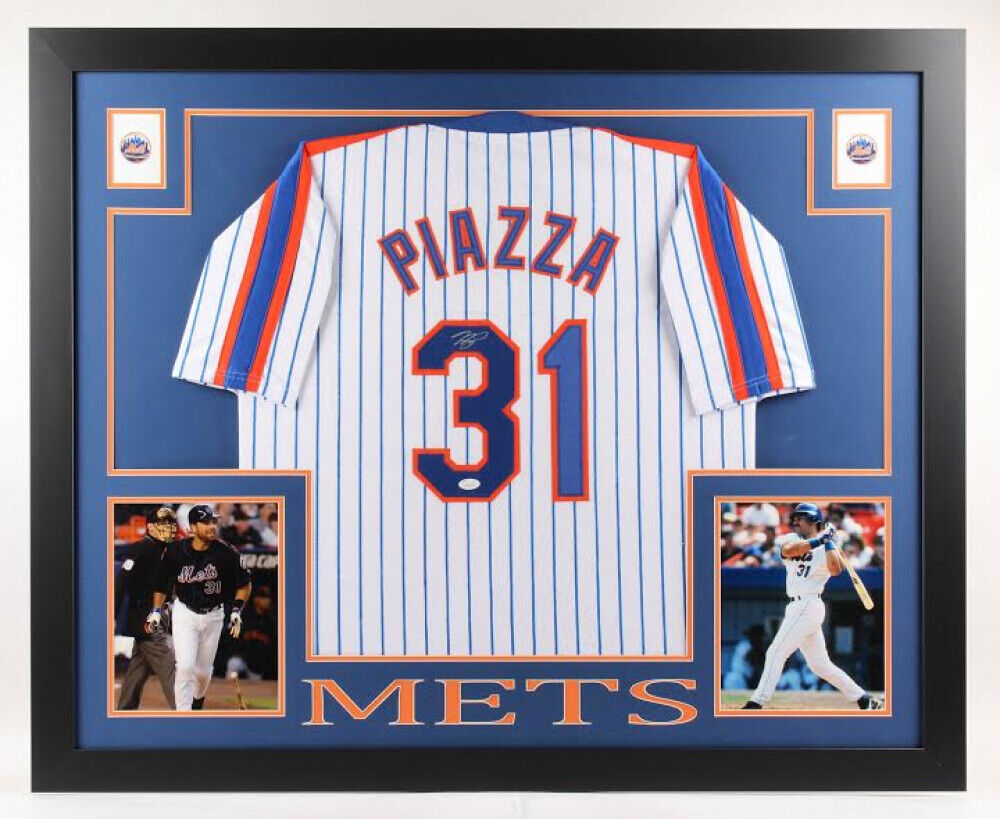 Custom frame measures approximately 35" x 43" in size and features a jersey which has been hand-signed in silver paint pen by Mike Piazza (HOF).The lot / autograph(s) includes an official James Spence Authentication (JSA) hologram and matching COA for authenticity purposes. The signing of this item was witnessed by JSA.Authentication: JSA COA