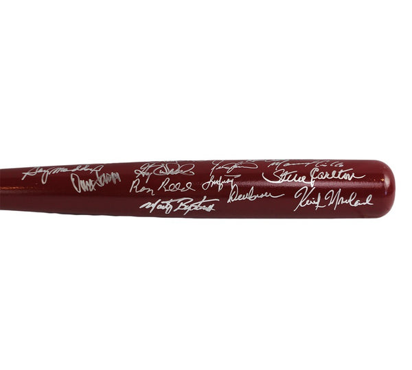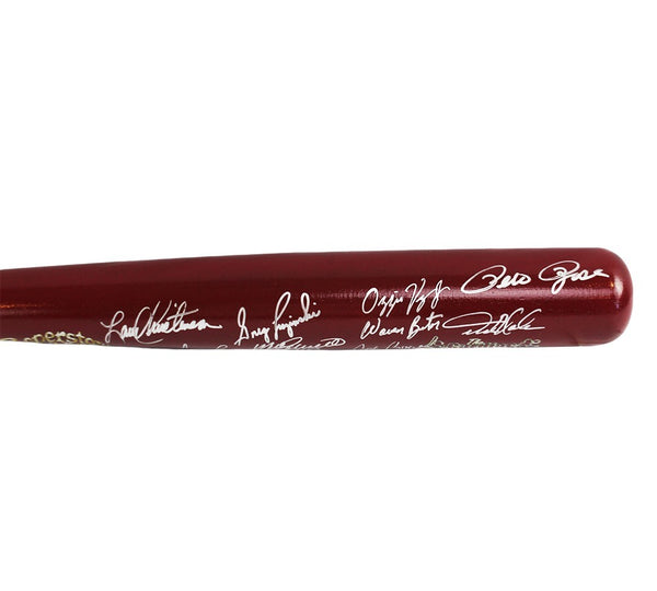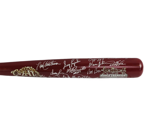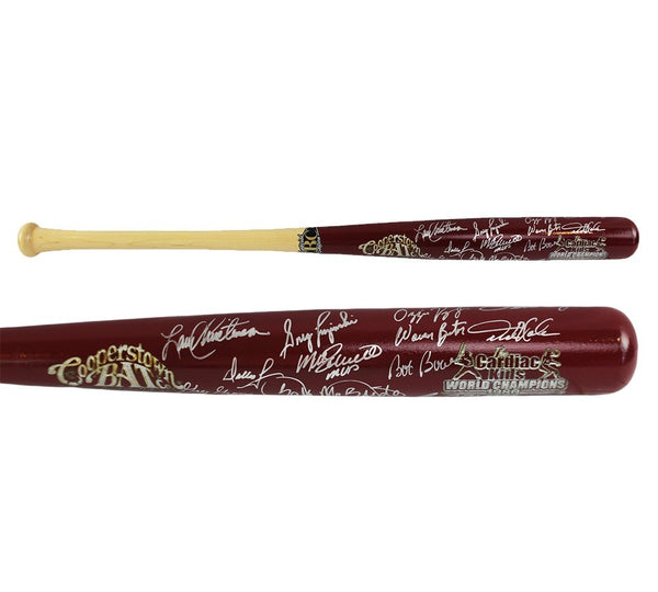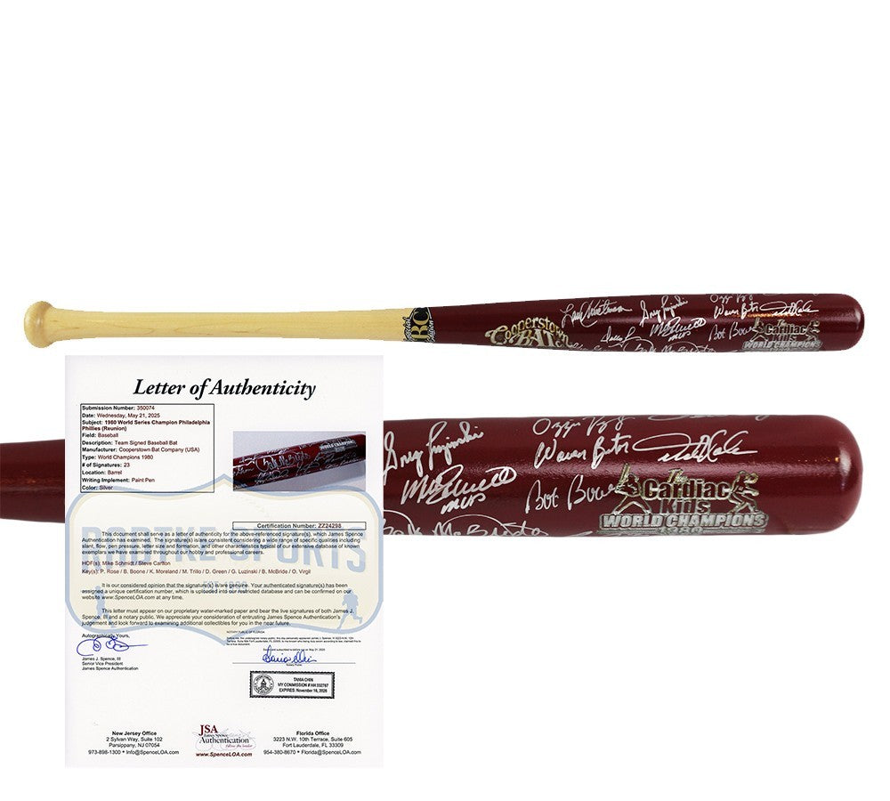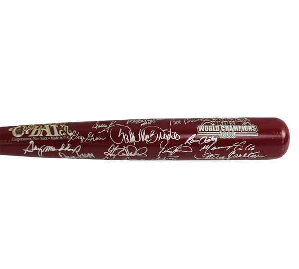 A Philadelphia Phillies 1980's Cardiac Kids World Series Champions Red/Blonde MLB Bat hand signed by 23 1980's World Series Champions including Mike Schmidt, Steve Carlton, Pete Rose, Bob Boone, Keith Moreland, Manny Trillo, Dallas Green, Greg Luzinski, Bake McBride, Ozzie Virgil. The item and signatures are in excellent condition. AUTHENTICATION: The item is accompanied by a JSA Letter of Authenticity - JSA Serial Numbered and Databased Hologram.