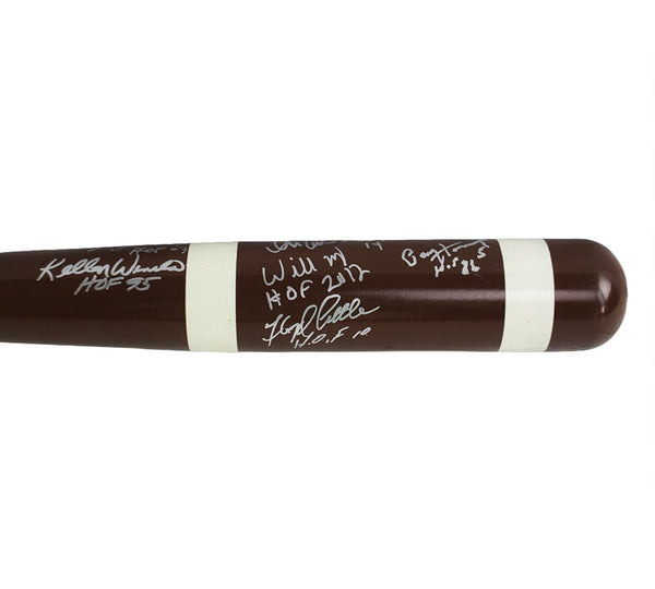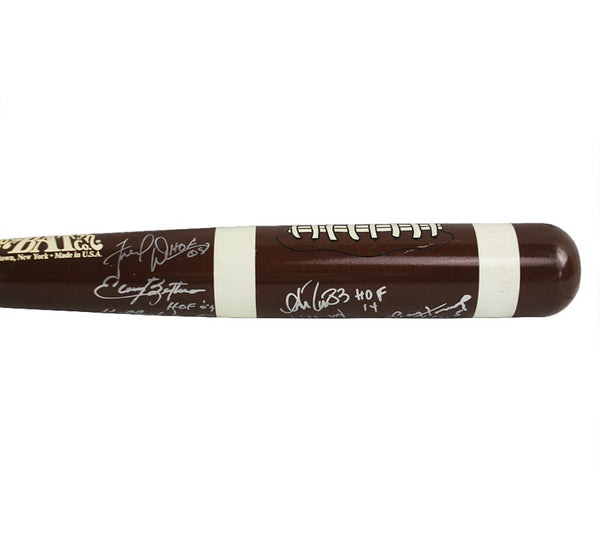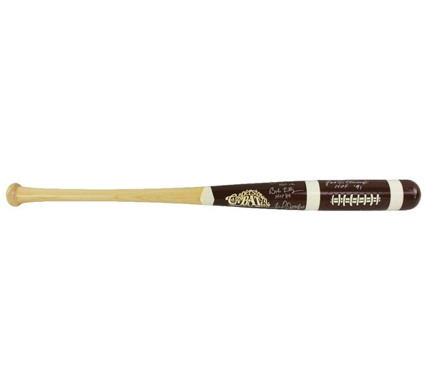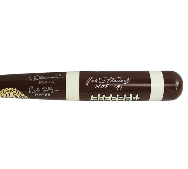 A NFL HOF Custom Cooperstown Hall of Fame Blonde & Brown Bat hand signed by Paul Hornung, Dermontti Dawson, Bob Lilly, Jan Stenerud, Fred Dean, Elvin Bethea, Kellen Winslow, Willie Roaf, Andre Reed, and Floyd Little. The item and signatures are in excellent condition. In addition to signing their names, they inscribed "HOF" on the item. AUTHENTICATION: The item is accompanied by a JSA Certificate of Authenticity - JSA Serial Numbered Hologram -