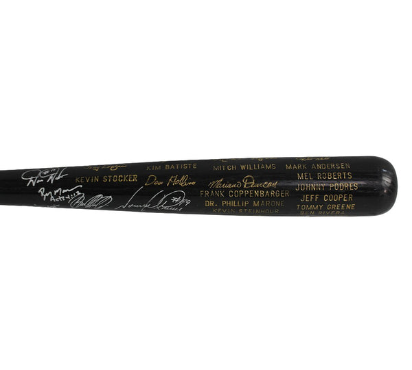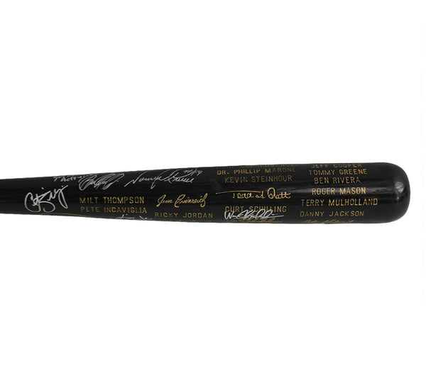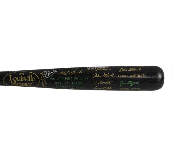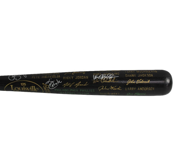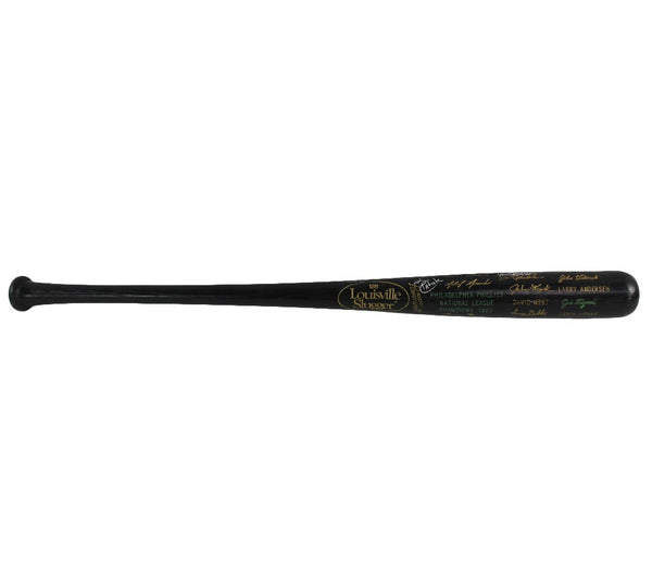 A Philadelphia Custom 1993 National League Louisville Slugger Black Bat hand signed by Curt Schilling, Wes Chamberlain, Darren Daulton, Kim Batiste, Tommy Greene, Roger Mason, and Ben Rivera. Curt was a six-time All-Star and three-time World Series champion who won 216 games, recorded 3,116 strikeouts (joining the 3,000-K club), earned both a World Series MVP (2001) and NLCS MVP (1993), and famously pitched through injury in the 2004 ALCS with his iconic "bloody sock" performance. Wes played six MLB seasons (1990-95) with the Phillies and Red Sox, hitting .255 with 43 home runs and 167 RBIs as a versatile outfielder/first baseman. AUTHENTICATION: The item is accompanied by a JSA Certificate of Authenticity - JSA Serial Numbered Hologram -