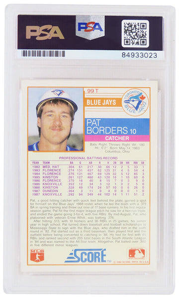 Pat Borders signed Toronto Blue Jays 1988 Score Traded rookie baseball card #99T with '92 WS Champs' inscription. The card has been authenticated and encapsulated by PSA/DNA and the number can be verified online. The image of the item is a stock photo, as we may have multiples of the item in stock. The Slabbed Card you will receive will be of the card described. (Same grade, Same authentication) You may or may not receive the exact PSA serial number on the slab label shown in image.