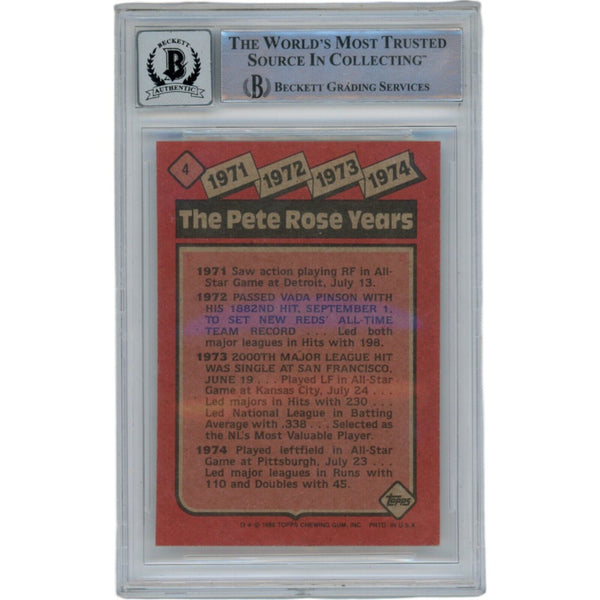 The number in the listing title is just an inventory sku for our records and is not the authentication number. The item pictured is a stock photo unless otherwise noted. This is a Cincinnati Reds 1986 Topps #4 Slabbed Trading Card with a 10 Grade Autograph that was personally autographed by Pete Rose. Includes a certificate of authenticity from Beckett Authentication Services (BAS) and Denver Autographs.