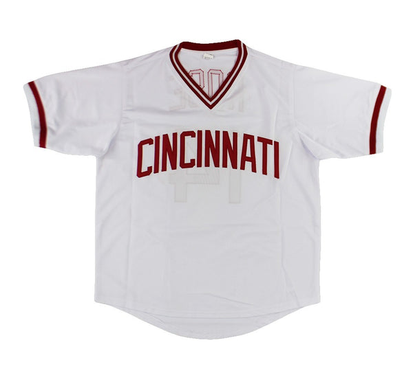 A Cincinnati Custom White Jersey hand signed by Pete Rose. The item and signature are in excellent condition. Pete is a 17x All-Star, 3x World Series Champion, 1973 National League Most Valuable Player, 1975 World Series Most Valuable Player, 3x National League Batting Champion, 2x Gold Glove Award winner and 1963 National League Rookie of the Year. AUTHENTICATION: The item is accompanied by a JSA Certificate of Authenticity - JSA Serial Numbered Hologram -