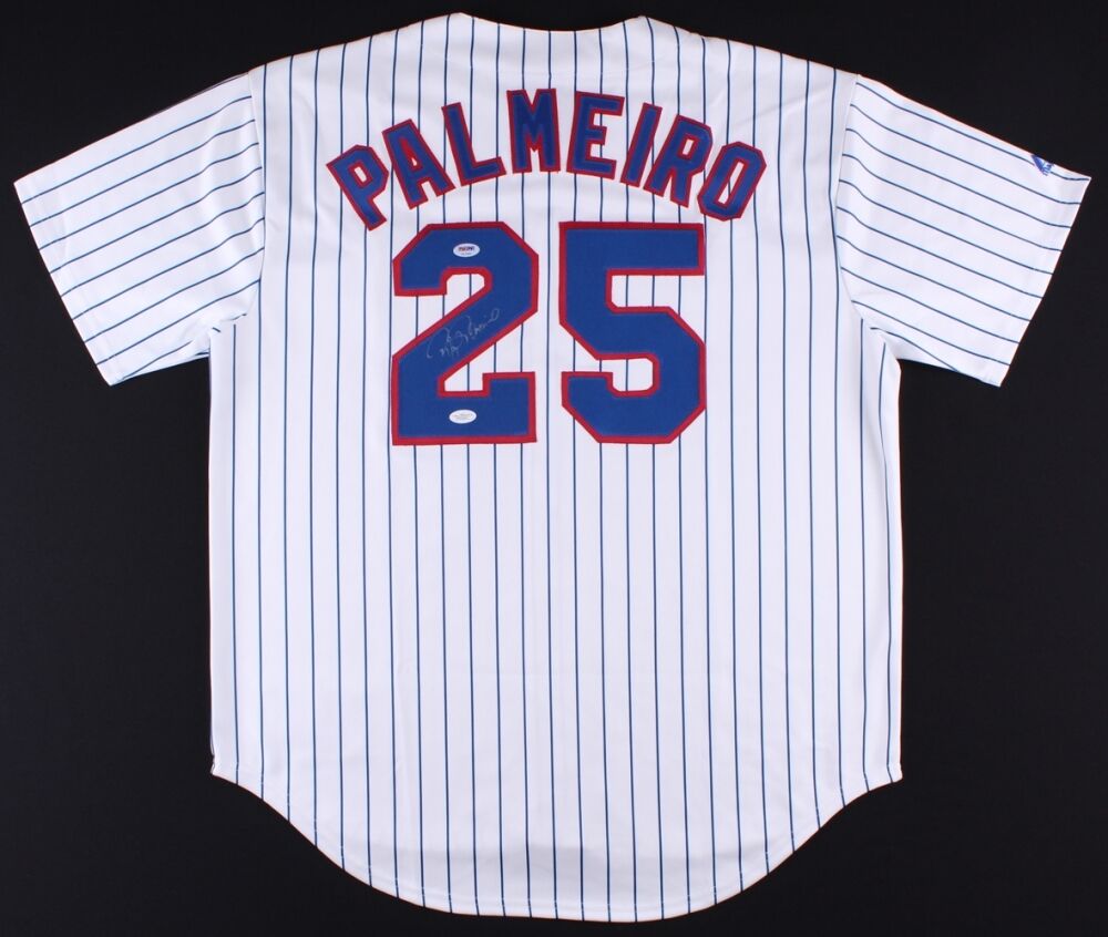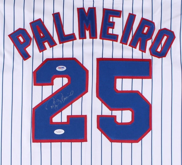 Majestic on-field style jersey. Everything is sewn on, size 2XL. Hand-signed in silver paint pen by Rafael Palmeiro (Orioles, Rangers). The autograph includes an official James Spence Authentication (JSA) hologram and matching COA as well as an official PSA/DNA hologram and matching COA for authenticity purposes. The signing of this item was witnessed by JSA.Authentication: JSA COA & PSA COA