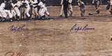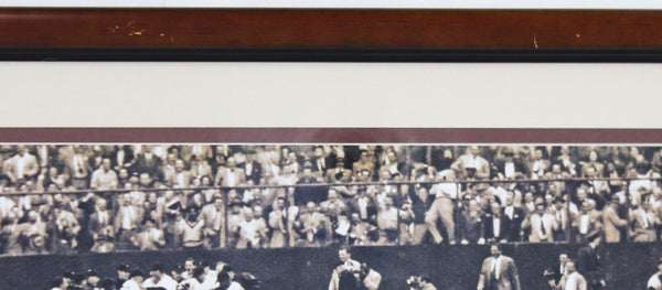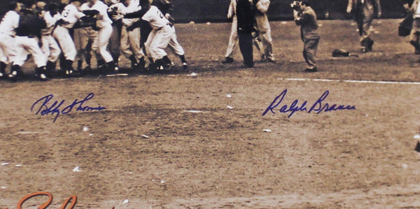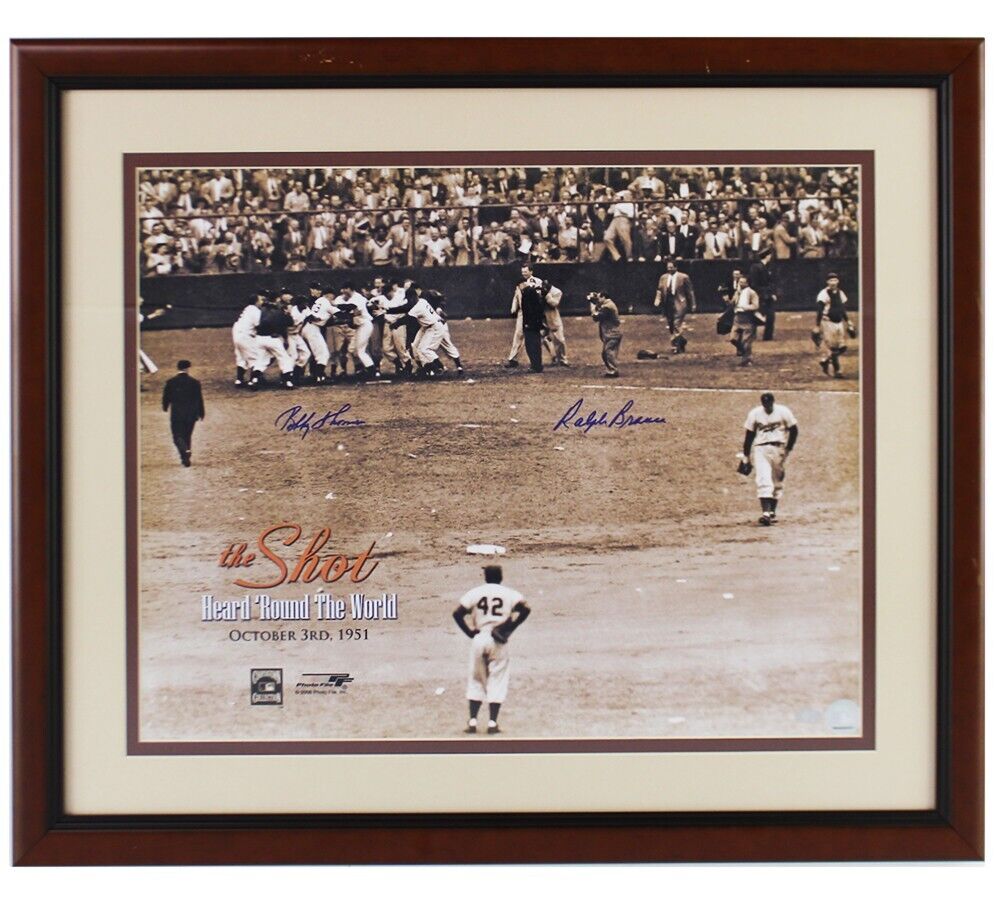 A Brooklyn Dodgers Vs New York Giants Framed 16x20 "The Shot Heard 'Round the World" MLB Photo The signatures are in excellent condition. The frame measures approximately 26"x22" and has some minor damage. "Shot Heard 'Round the World" was a walk-off home run hit by New York Giants outfielder and third baseman Bobby Thomson off Brooklyn Dodgers pitcher Ralph Branca at the Polo Grounds in New York City on October 3, 1951, to win the National League (NL) pennant. AUTHENTICATION: The item is tagged with a MAB Celebrity Services Hologram