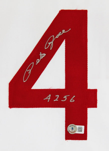 This Autographed White Pro Style Jersey with the inscription of "4256" has been Personally Signed by Pete Rose of the Cincinnatti Reds. This item is 100% Authentic to include a hologram by Beckett Authentication Services. This item will come with an affixed Beckett Authentication Services (BAS) authentication sticker, which includes a scannable QR code to verify authenticity. Please note that Beckett no longer provides serial-numbered COA cards, and the attached BAS sticker will serve as the complete authentication for this item. We have multiples of this same item. While the photographs are representative of this item, the size, placement and strength of the signature may vary. Each item is hand signed, therefore, each autograph is unique. This is a X-Large sized, non-branded, custom-stitched Jersey.