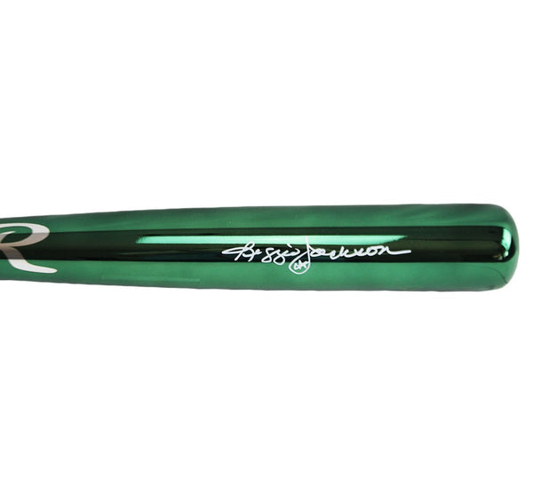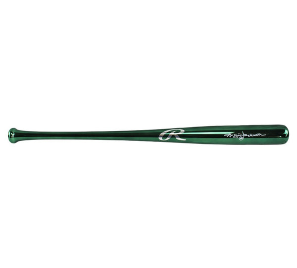 An Oakland Athletics Rawlings Green Chrome MLB Bat hand signed by Reggie Jackson. The item and signature are in excellent condition. Reggie, nicknamed "Mr. October" for his post-season heroics, is a 14-time All-Star, 5-time World Series Champion, and the 1973 AL MVP. He finished his career with 563 homeruns and an induction into the Hall of Fame in 1993. AUTHENTICATION: The item is accompanied by a Beckett Serial Numbered and Databased Hologram