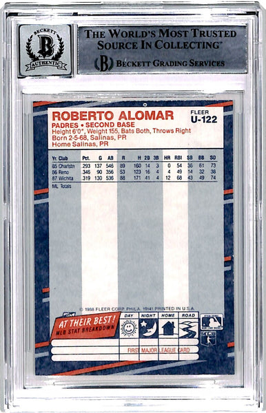 The number in the listing title is just an inventory sku for our records and is not the authentication number. The item pictured is a stock photo unless otherwise noted. This is a San Diego Padres 1988 Fleer Update #U-122 slabbed trading card with a grade 10 autograph that was personally autographed by Roberto Alomar. Includes a certificate of authenticity from Beckett Authentication Services (BAS) and Denver Autographs.FREE SHIPPING within the USA on orders over $10!