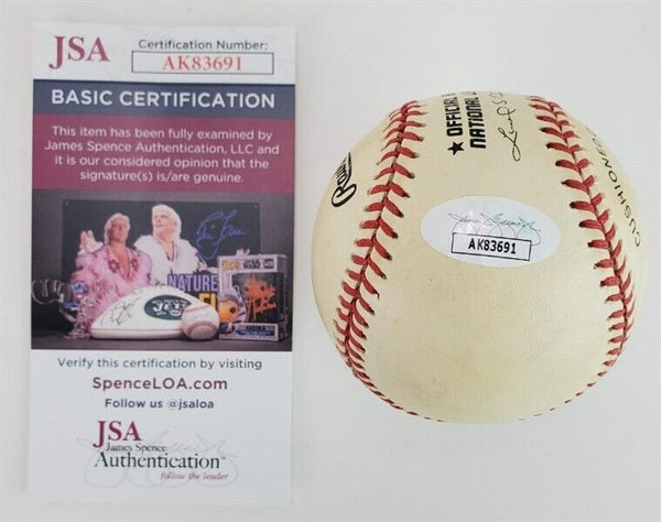 This autographed Official National League baseball has been personally hand-signed by Ron Santo of the Chicago Cubs.This autograph is certified by James Spence Authentication (JSA). It comes with the numbered hologram and matching Certificate of Authenticity.Please see all photos regarding the condition of this baseball. Check out all the items in our Friendly Confines Collectibles store, Thanks for looking.