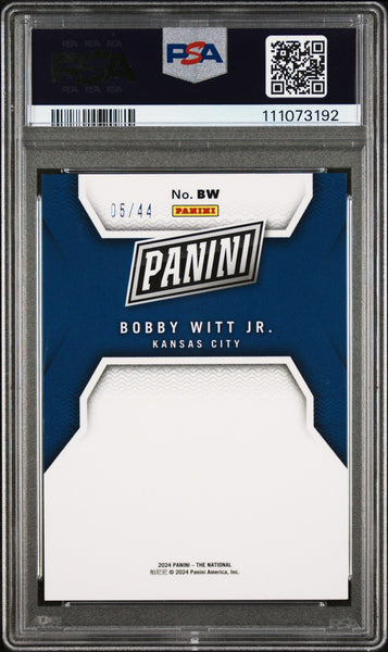 This Autographed 2024 Panini National Sports Collectors Convention Silver Pack National Insert Holo #BW #5/44 Card has been Personally Signed by Bobby Witt Jr. of the Kansas City Royals. This item is 100% Authentic, it comes slabbed and authenticated by PSA. This item is not autographed. The authenticity can be verified on Professional Sports Authenticator website.