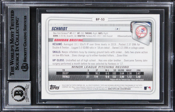 This Autographed Auto Graded Gem Mint 10! 2020 Bowman Prospects Camo #BP53 Card has been Personally Signed by Clarke Schmidt of the Kansas City Royals. This item is 100% Authentic, it comes slabbed and authenticated by Beckett Authentication Services. The authenticity can be verified on Beckett Authentication Services website.