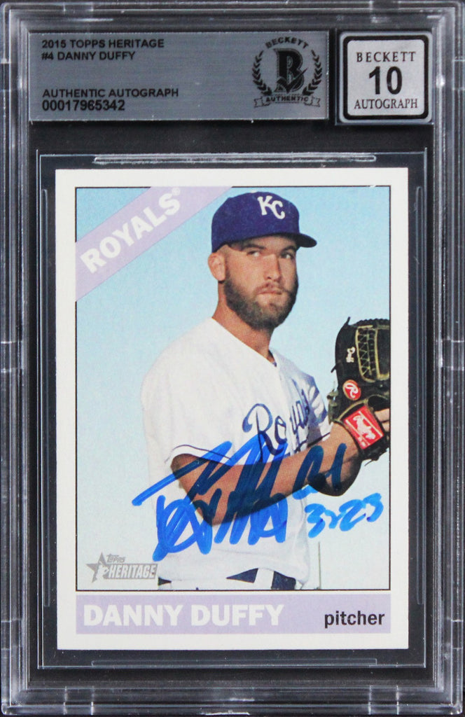 This Autographed Auto Graded Gem Mint 10! 2015 Topps Heritage #4 Card has been Personally Signed by Danny Duffy of the Kansas City Royals. This item is 100% Authentic, it comes slabbed and authenticated by Beckett Authentication Services. The authenticity can be verified on Beckett Authentication Services website.
