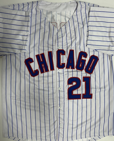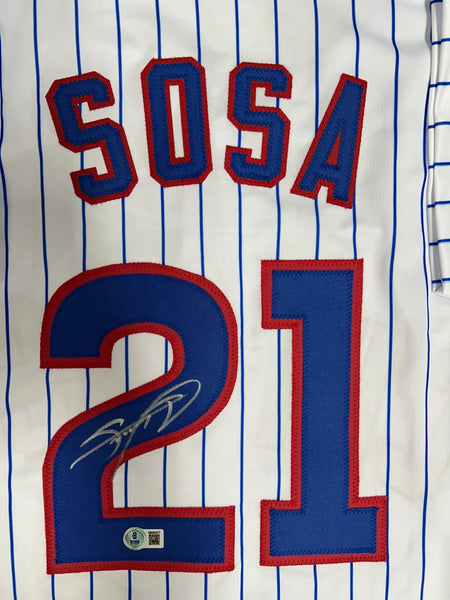 Custom replica jersey of Chicago Cubs MVP SAMMY SOSA. This jersey is signed with Silver Paint Pen. This jersey is size XL with all letters and numbers sewn in. This item would make a great addition to any Cubs collection. This autograph is guaranteed to be 100% authentic and will include a COA from Beckett Authentication.