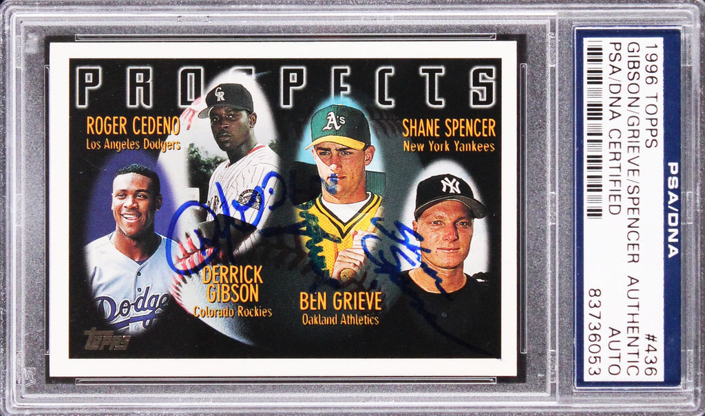 This Autographed 1996 Topps #436 Card has been Personally Signed by Shane Spencer, Ben Grieve & Derrick Gibson. This item is 100% Authentic, it comes slabbed and authenticated by PSA/DNA. We have multiples of this same item. While the photographs are representative of this item, the size and placement of the signature may vary. Each item is hand signed, therefore, each autograph is unique.