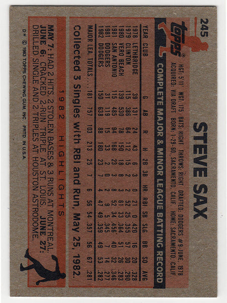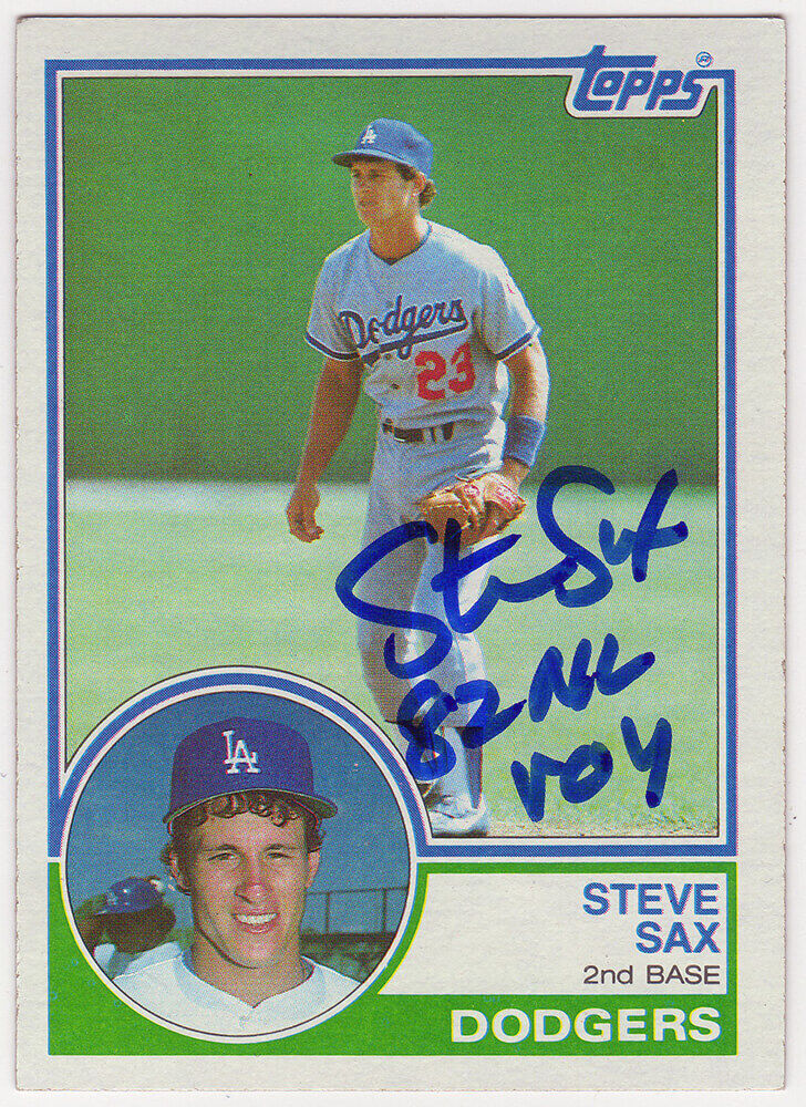 Steve Sax Signed Los Angeles Dodgers 1983 Topps baseball trading card #245 with '82 NL ROY' inscription. Item comes with a Schwartz Sports Memorabilia tamper-proof numbered hologram (on back of physical card) and Certificate of Authenticity which can be verified online.