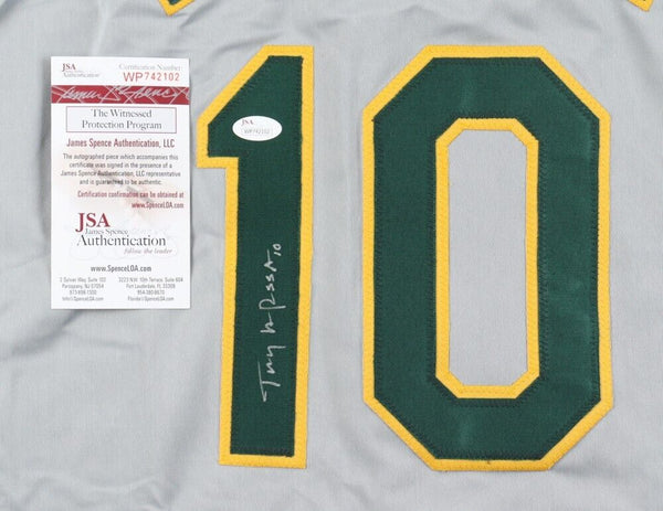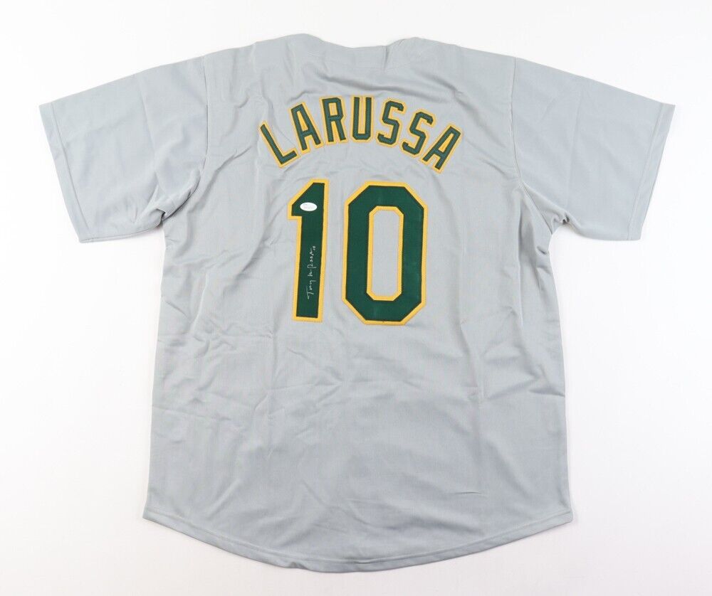 Custom on-field style jersey. Everything is sewn on, size XL. Hand-signed in silver paint pen by Tony La Russa (Chicago White Sox, Oakland A's, St. Louis Cardinals, HOF).The autograph includes an official James Spence Authentication (JSA) hologram and matching COA for authenticity purposes. The signing of this item was witnessed by JSA.Authentication: JSA COA
