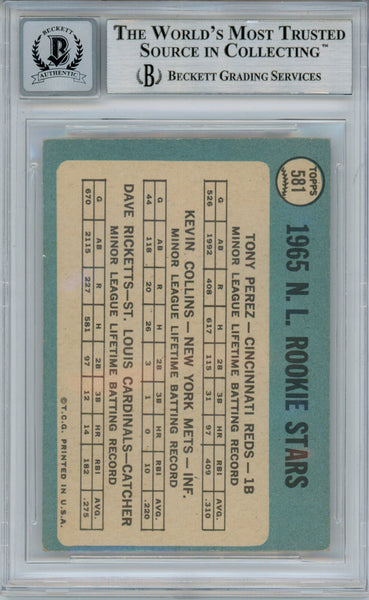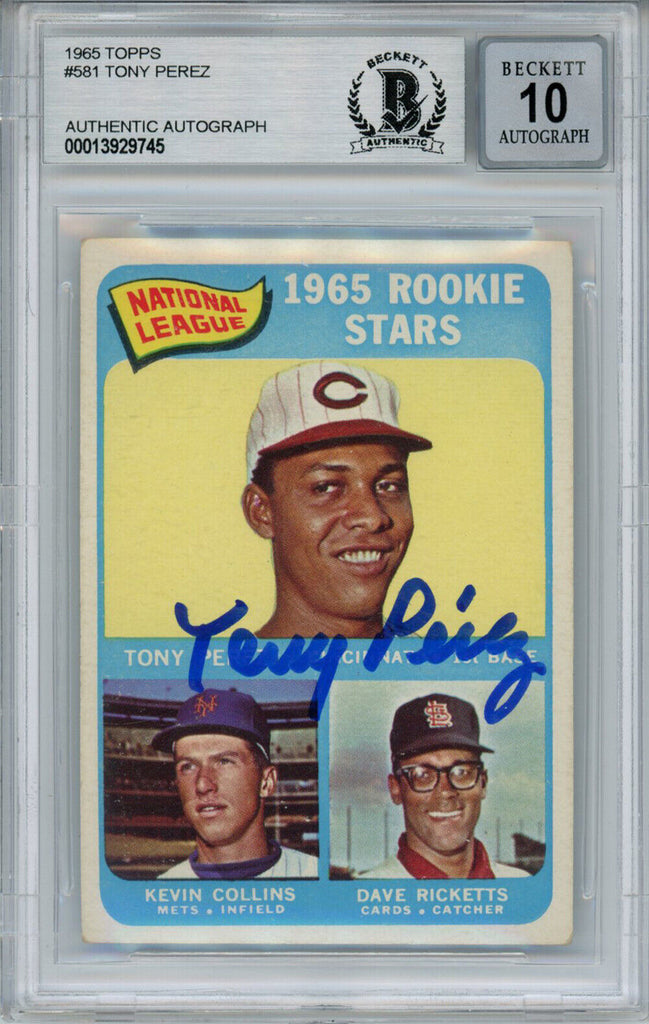 Tony Perez Autographed 1965 Topps #581 Rookie Card Beckett 10 Slab 33690 The number in the listing title is just an inventory sku for our records and is not the authentication number. The item pictured is a stock photo unless otherwise noted. This is a trading card that was personally autographed by Tony Perez. This has been professionally slabbed by Beckett Authentication Services (BAS) and includes a certificate of authenticity from Denver Autographs.