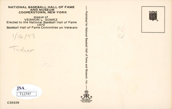 This Autographed HOF Plaque 3.5x5.5 Postcard has been Personally Signed by Lefty Gomez of the New York Yankees. This item is 100% Authentic to include a Certificate of Authenticity (COA) / hologram by JSA. The authenticity can be verified on JSA website.