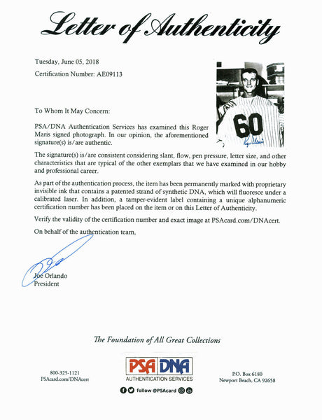 This Autographed Black & White 8x10 Vintage Photo has been Personally Signed by Roger Maris of the New York Yankees. There is a small 'dimple' to the right side of his head. Please see photo before purchase! This item is 100% Authentic and comes with a PSA/DNA Certification Card and a matching numbered Hologram. The authenticity can be verified on Professional Sports Authenticator website. We only offers Authentic Autographs by Roger Maris through Signings, In-Person Signings or Private Collections to include a 100% money back Lifetime Authenticity Guarantee.