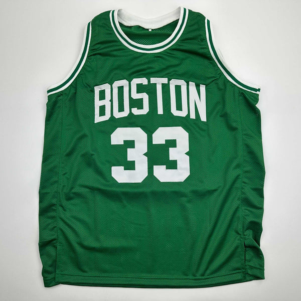 Autographed/Signed Larry Bird Boston Green Basketball Jersey Beckett BAS COA Jersey has no brand names or logos. This is a custom jersey and was not manufactured by or in any manner associated with any professional sports league or manufacturer. This custom jersey carries no professional sports league designation. The item is intended to be an autographed collectible. The custom jersey displays the name and number of the player. This item in no way is affiliated with or connected to any professional sports organization. Size is XL.