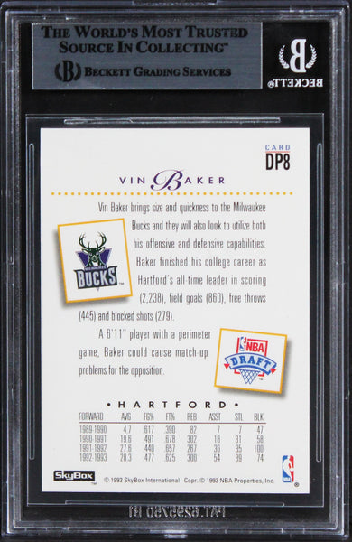 This Autographed 1993 Skybox Premium Draft Picks D#DDP8 Card has been Personally Signed by Vin Baker of the Milwaukee Bucks. This item is 100% Authentic, it comes slabbed and authenticated by Beckett Authentication Services. The authenticity can be verified on Beckett Authentication Services website.