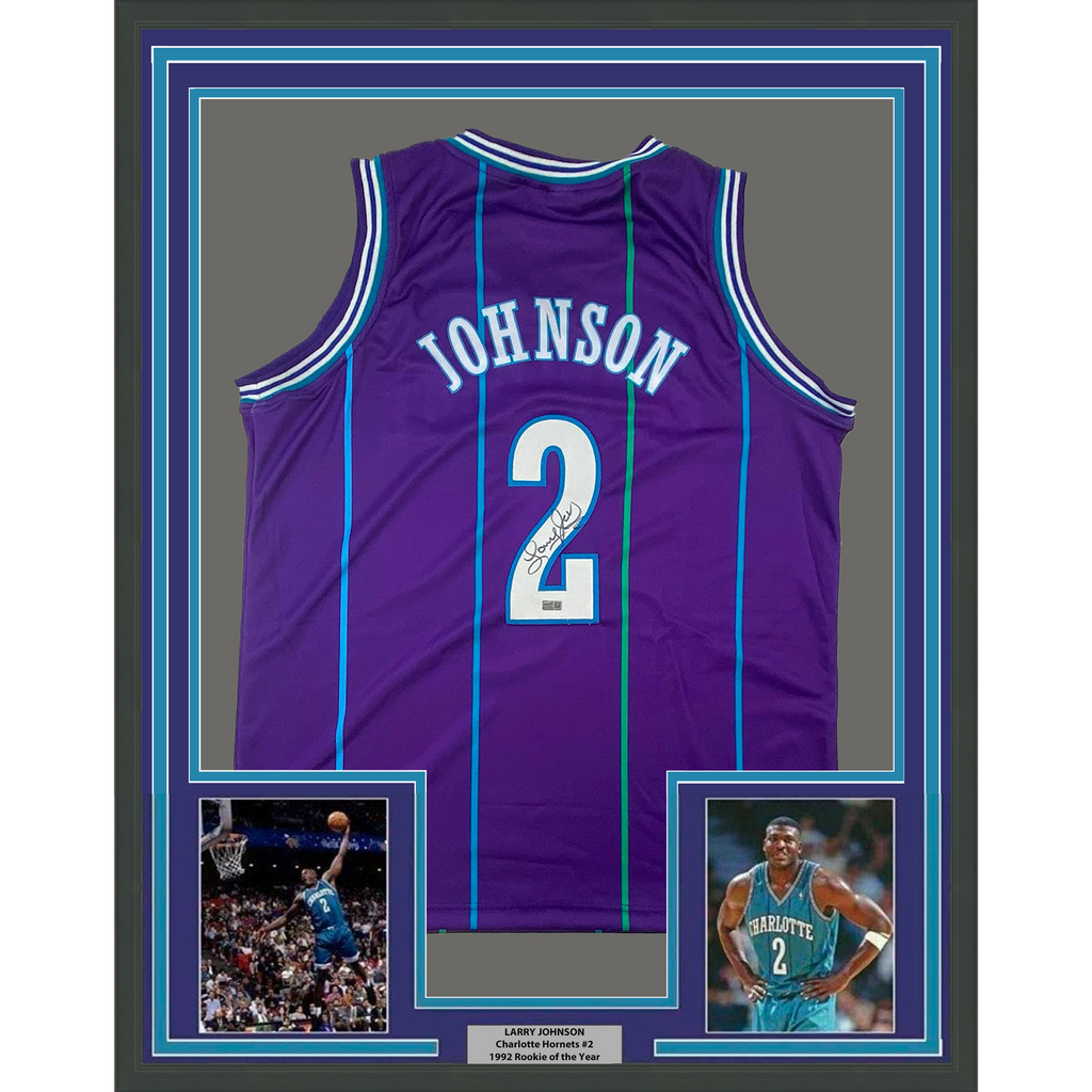 Framed Autographed/Signed Larry Johnson 33x42 Purple Jersey Steiner COA