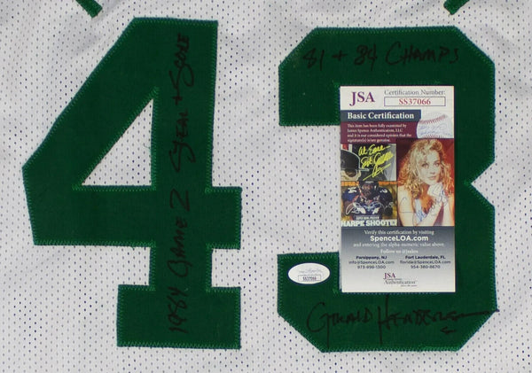 This autographed jersey has been personally hand-signed by Gerald Henderson of the Boston Celtics. When signing, Henderson inscribed "1984 Game 2 Steal + Score" and "81 + 84 Champs" along with his signature.This autograph is certified by James Spence Authentication (JSA). It comes with the numbered hologram and matching Certificate of Authenticity.Custom on-court style jerseys are a more affordable option for autograph seekers. These jerseys do not have any brand name or tags and are made in the Philippines. They feature stitched on names and numbers and are made to look very similar to the on-field jerseys that the players wear. These custom jerseys are very commonly used in the memorabilia industry.