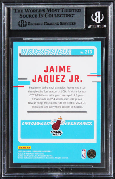 This Autographed 2023 Donruss #213 Rookie Card has been Personally Signed by Jaime Jaquez Jr. of the Miami Heat . This item is 100% Authentic, it comes slabbed and authenticated by Beckett Authentication Services. The authenticity can be verified on Beckett Authentication Services website.