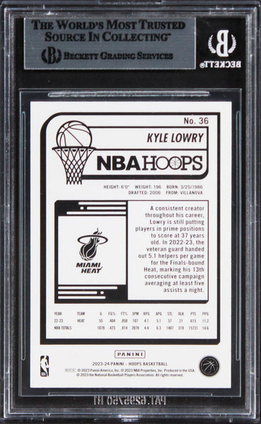 This Autographed 2023 Hoops #36 Card has been Personally Signed by Kyle Lowry of the Miami Heat . This item is 100% Authentic, it comes slabbed and authenticated by Beckett Authentication Services. The authenticity can be verified on Beckett Authentication Services website.