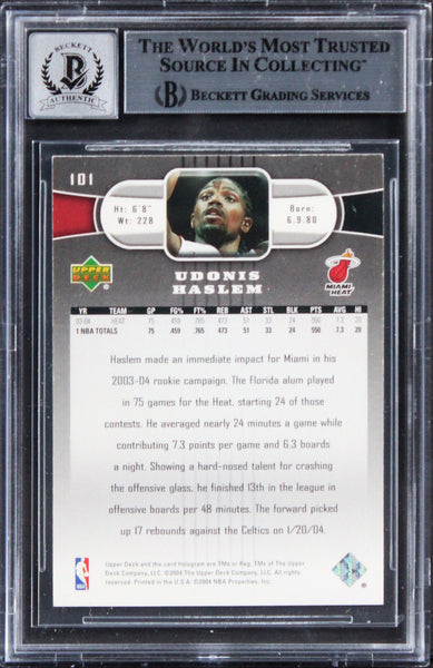 This Autographed Auto Graded Gem Mint 10! 2004 Upper Deck #101 Card has been Personally Signed by Udonis Haslem of the Miami Heat . This item is 100% Authentic, it comes slabbed and authenticated by Beckett Authentication Services. The authenticity can be verified on Beckett Authentication Services website.