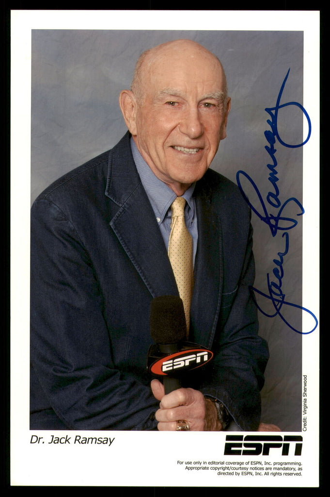 This is a 5.5x8.5 that has been hand signed by Jack Ramsay. This item is guaranteed to pass any third party authentication company including Beckett, PSA/DNA, & JSA authentication.