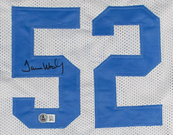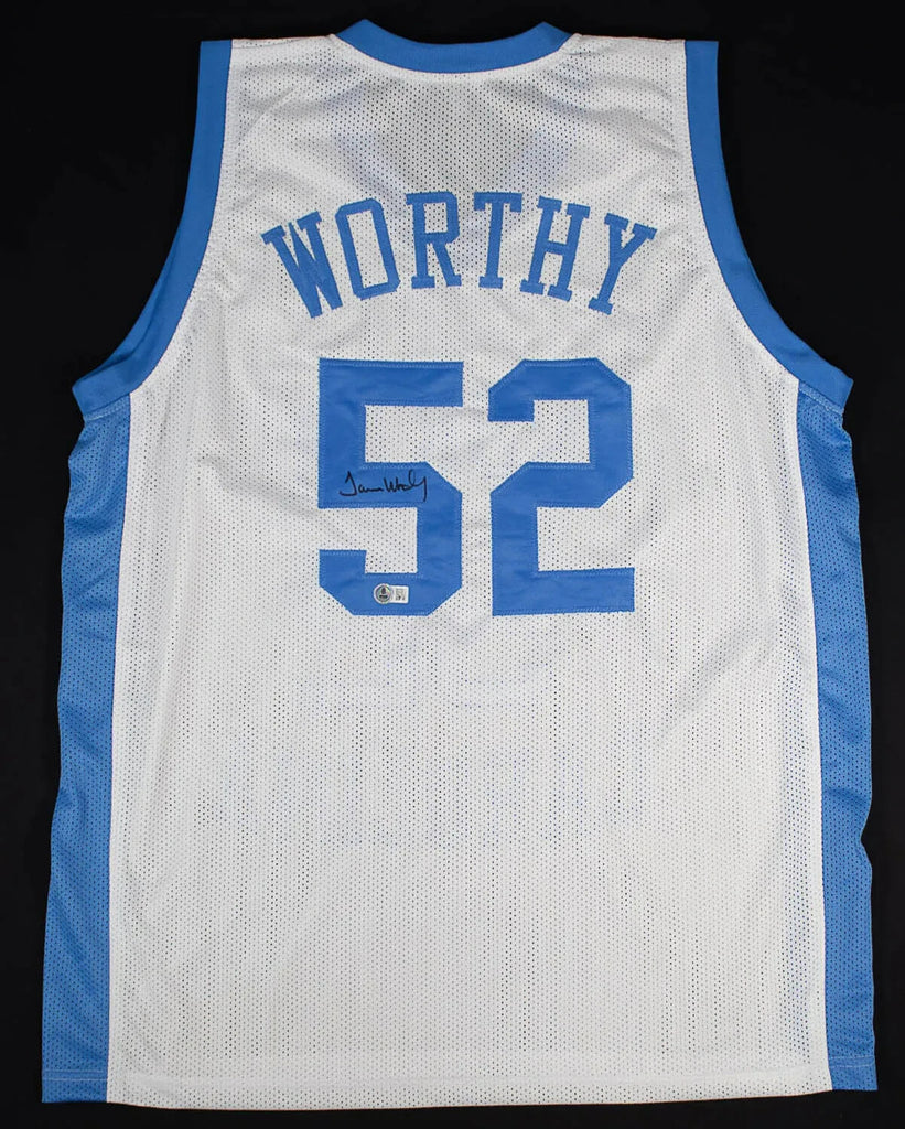 This autographed jersey has been personally hand-signed and inscribed "82 NCAA Champs" by James Worthy of the North Carolina Tar Heels.This autograph is certified by Beckett Authentication Services (BAS) Witness Certification. That means that a Beckett representative was present when this item was signed. It comes with the numbered authentication hologram with a QR code card that verifies the authentication on the Beckett website.Custom on-field style jerseys are a more affordable option for autograph seekers. These jerseys do not have any brand name or tags and are made in the Philippines. They feature stitched on names and numbers and are made to look very similar to the on-field jerseys that the players wear. These custom jerseys are very commonly used in the memorabilia industry.