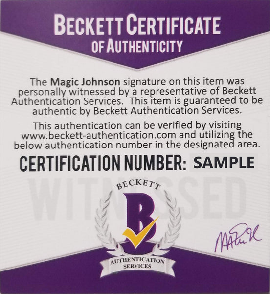 This Autographed 6x6 Floorboard has been Personally Signed by Magic Johnson of the Los Angeles Lakers. This item is 100% Authentic to include a Certificate of Authenticity (COA) / hologram by Beckett Authentication Services. This is a BAS Witnessed Protection Program item which means a Beckett Authentication Service representative was present when this item was being signed. This is a stock item. We conducted an autograph signing with Magic Johnson and we have several of these available. The one you will receive will be of equal quality to the one pictured. This item can be verified through BAS Witnessed. We only offers Authentic Autographs by Magic Johnson through Signings, In-Person Signings or Private Collections to include a 100% money back Lifetime Authenticity Guarantee.