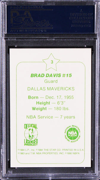 This Autographed 1984 Star #3 Rookie Card has been Personally Signed by Brad Davis of the Dallas Mavericks. This item is 100% Authentic, it comes slabbed and authenticated by PSA/DNA. The authenticity can be verified on Professional Sports Authenticator website.