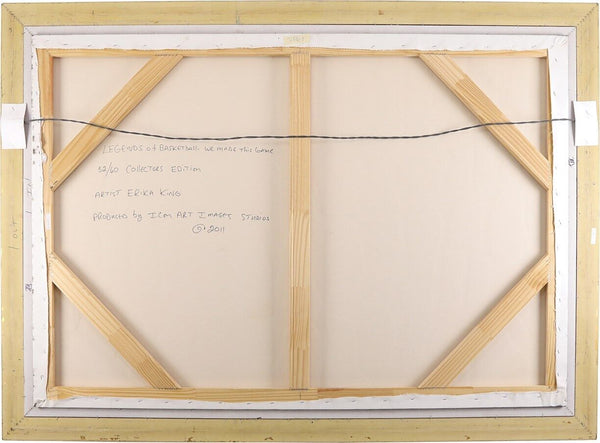 This Autographed Artwork Collector's Limited Edition 52/60 NBA Legends Of Basketball "We Made This Game" Lithograph has been Personally Signed by Dolph Shayes, Willis Reed, Chuck Hayes, Nate Thurmond, Bill Bradley, Rick Barry, Hakeem Olajuwon, Magic Johnson, Clyde Drexler, Larry Bird, Michael Jordan, Kevin Garnet, Artis Gilmore, Bob Pettit, Dwight Howard, Kobe Bryant, John Havlicek, John Stockton, George Gervin, Gary Payton, Paul Pierce, Bob McAdoo, David Robinson, Julius Erving, Jason Kidd, Jerry West, Kevin McHale, Dominique Wilkins, Hal Greer, Allen Iverson, Bill Walton, Bob Cousy, LeBron James, Oscar Robinson, Shaquille O'Neal, Bill Russell, Moses Malone, Charles Barkley, Chris Paul, Yao Ming, Connie Hawkins, Steve Nash, Dwyane Wade, Elgin Baylor, Dave Cowens, Walt Frazier, James Worthy, Vince Carter, Adrian Dantley, Bill Sharman, Dennis Rodman, Dirk Nowitzki, Robert Parish, Carmelo Anthony, Deron Williams, Earl Monroe, Lenny Wilkins, David Stern & Erika King (artist). This item is 100% Authentic to include a hologram by Beckett Authentication Services. This item will come with an affixed Beckett Authentication Services (BAS) authentication sticker, which includes a scannable QR code to verify authenticity. Please note that Beckett no longer provides serial-numbered COA cards, and the attached BAS sticker will serve as the complete authentication for this item. The authenticity can be verified on Beckett Authentication Services website. This item has been professionally stretched, mounted & framed to overall dimensions of approximately 48 x 68 inches. This large canvas has over fifty NBA greats, players who redefined and reinvented the game of basketball over the past five decades. This visually impactful piece features the original abstract paint background by artist Erika King upon which color action shots of 60 of the greatest NBA players have mounted, each signed by the appropriate player along with David Stern & the artist Erika King.