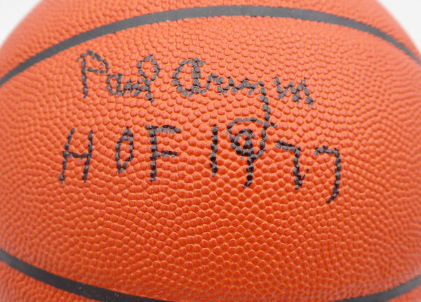 This is a Spalding I /O Basketball that has been hand signed by Paul Arizin. This item was inscribed "HOF 1977." This item has been certified authentic by JSA and comes with their tamper-proof sticker and matching certificate of authenticity.