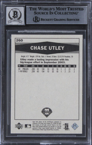 This Autographed Auto Graded Gem Mint 10! 2004 Upper Deck Vintage #260 Card has been Personally Signed by Chase Utley of the Philladelphia Phillies. This item is 100% Authentic, it comes slabbed and authenticated by Beckett Authentication Services. The authenticity can be verified on Beckett Authentication Services website.