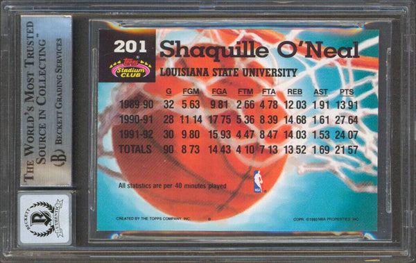 This Autographed Auto Graded Gem Mint 10! 1992 Stadium Club #201 Rookie Card has been Personally Signed by Shaquille O'Neal of the Orlando Magic. This item is 100% Authentic, it comes slabbed and authenticated by Beckett Authentication Services. This is a stock item. We conducted an autograph signing with Shaquille O'Neal and we have several of these available. The one you will receive will be of equal quality to the one pictured. This item can be verified through BAS Slabbed.