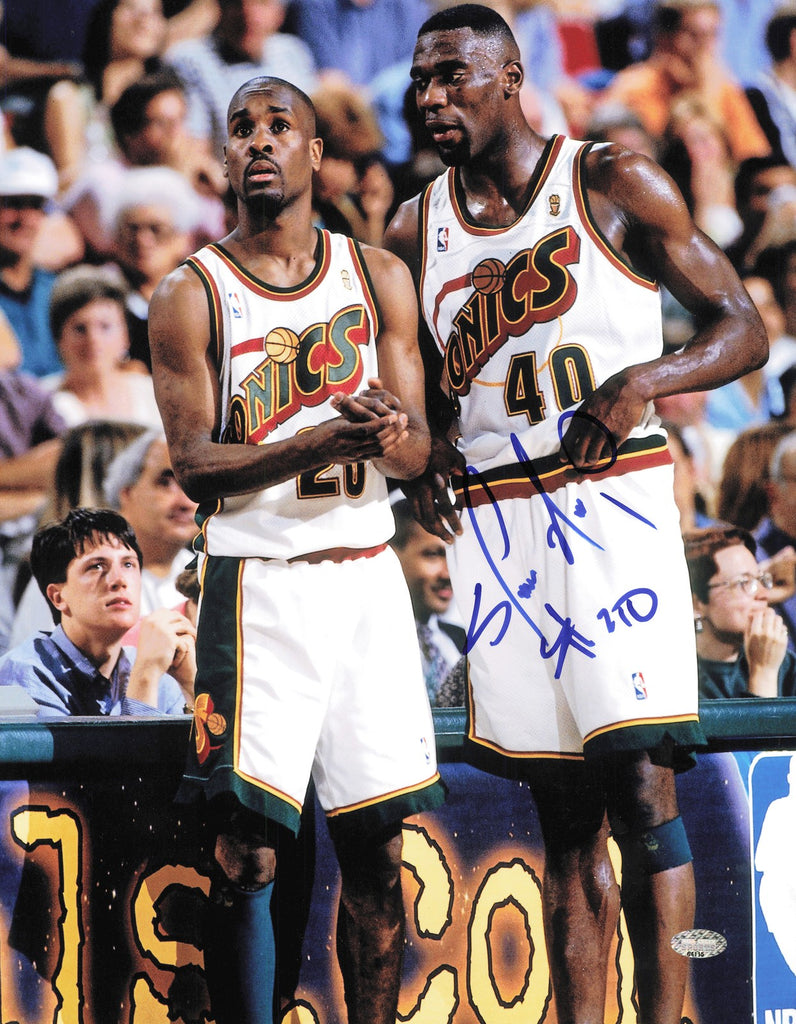 This is an 11x14 Photo that has been hand signed by Shawn Kemp. This item was signed in the presence of a Mill Creek Sports representative and comes with their serial numbered hologram and matching certificate of authenticity.