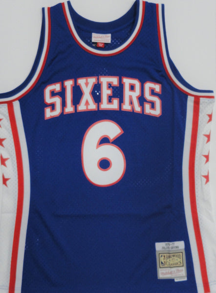 Official Swingman Mitchell & Ness Jersey hand signed by Philadelphia Seventy Sixers Hall of Famer JULIUS ERVING. The signature is in Black Sharpie. This item was signed at a private signing with us and would make a great addition to any 76ers collection! The jersey size is Large. This autograph is guaranteed to be 100% authentic and will include a COA from JSA authentication.