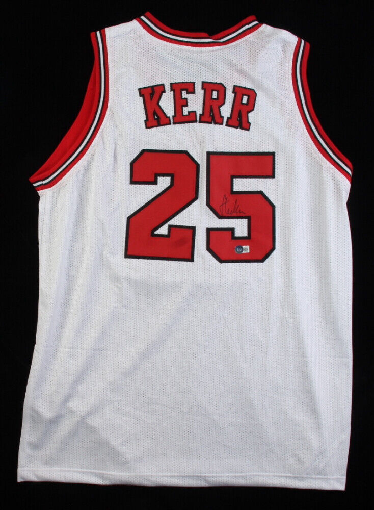 Custom on-court style jersey. Everything sewn on, size XL. Hand-signed by Steve Kerr.The lot / autograph(s) includes an official Beckett Authentication Services serially-numbered hologram and matching COA for authenticity purposes.Authentication: Beckett COA