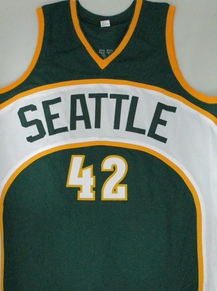 Custom Replica white Jersey (XL) hand signed by former Seattle Supersonics legend VIN BAKER. The signature is in Black sharpie and includes the inscription "4 x All Star". This jersey was signed at a public signing with us and would make a great addition to any Sonics collection! The jersey size is XL and All letters and numbers are sewn in. This autograph is guaranteed to be 100% authentic and will include a COA from JSA Authentication.