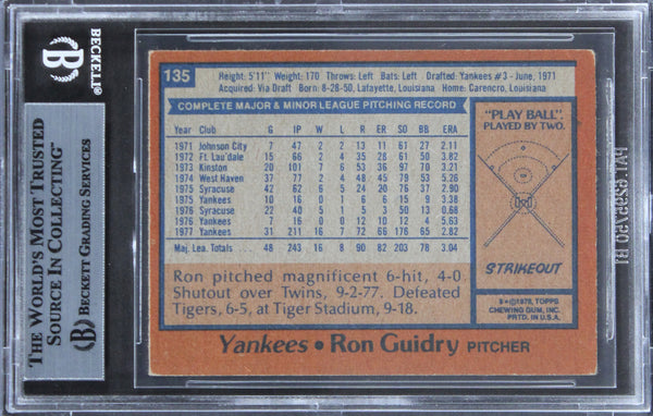 This Autographed 1978 Topps #135 Card has been Personally Signed by Ron Guidry of the New York Yankees. This item is 100% Authentic, it comes slabbed and authenticated by Beckett Authentication Services. The authenticity can be verified on Beckett Authentication Services website.