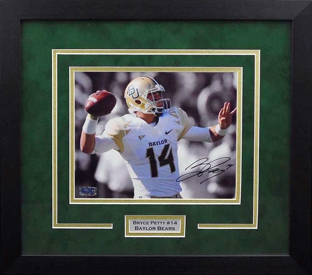 Bryce Petty, former star quarterback for the Baylor Bears, has hand signed this 8x10 photo at a private signing. It comes professionally framed in a black wood frame and double matted in Baylor Bears colors. This item comes with a certificate of authenticity (COA) from Signature Sports Marketing, one of the leaders in the industry. You will receive a paper COA along with matching serial-numbered holograms.Item pictured may not be the exact item you will receive. It will be similar quality, and we guarantee your satisfaction.