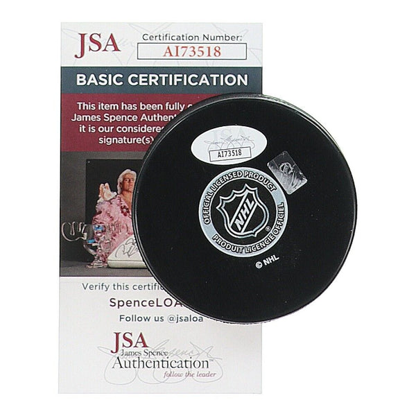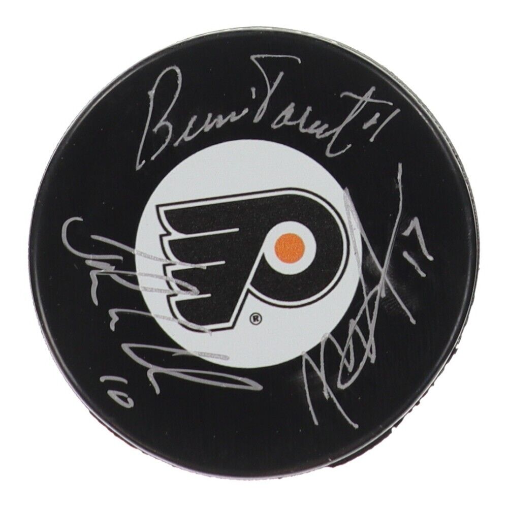 Philadelphia Flyers logo hockey puck has been hand-signed by Bernie Parent (HOF), John Leclair and Rod Brind'Amour. The autograph includes an official James Spence Authentication (JSA) hologram and matching COA for authenticity purposes.Authentication: JSA COA