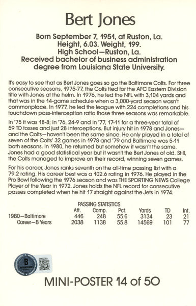 Bert Jones Autographed Baltimore Colts Mini Poster 14/50 Beckett 46132